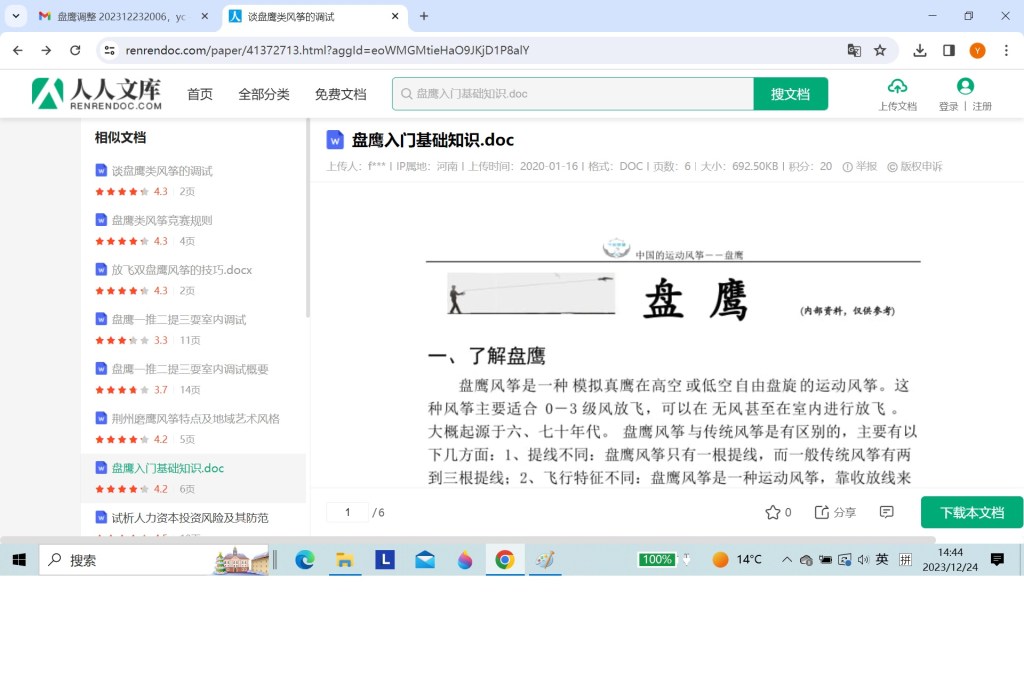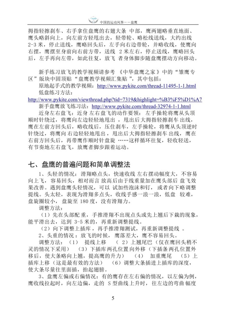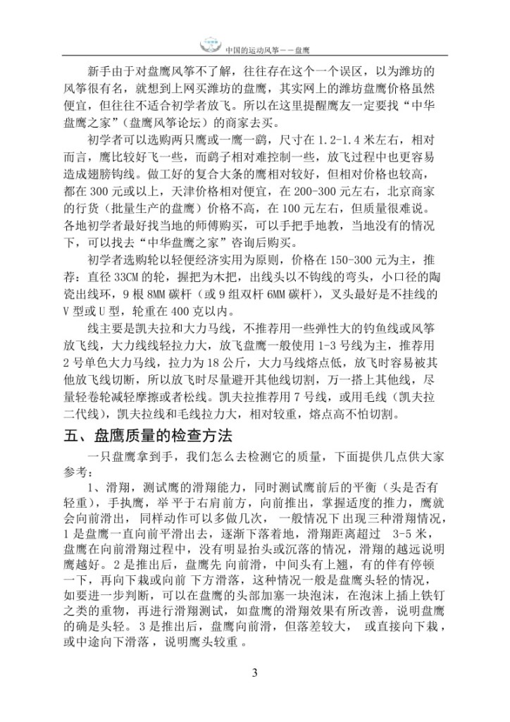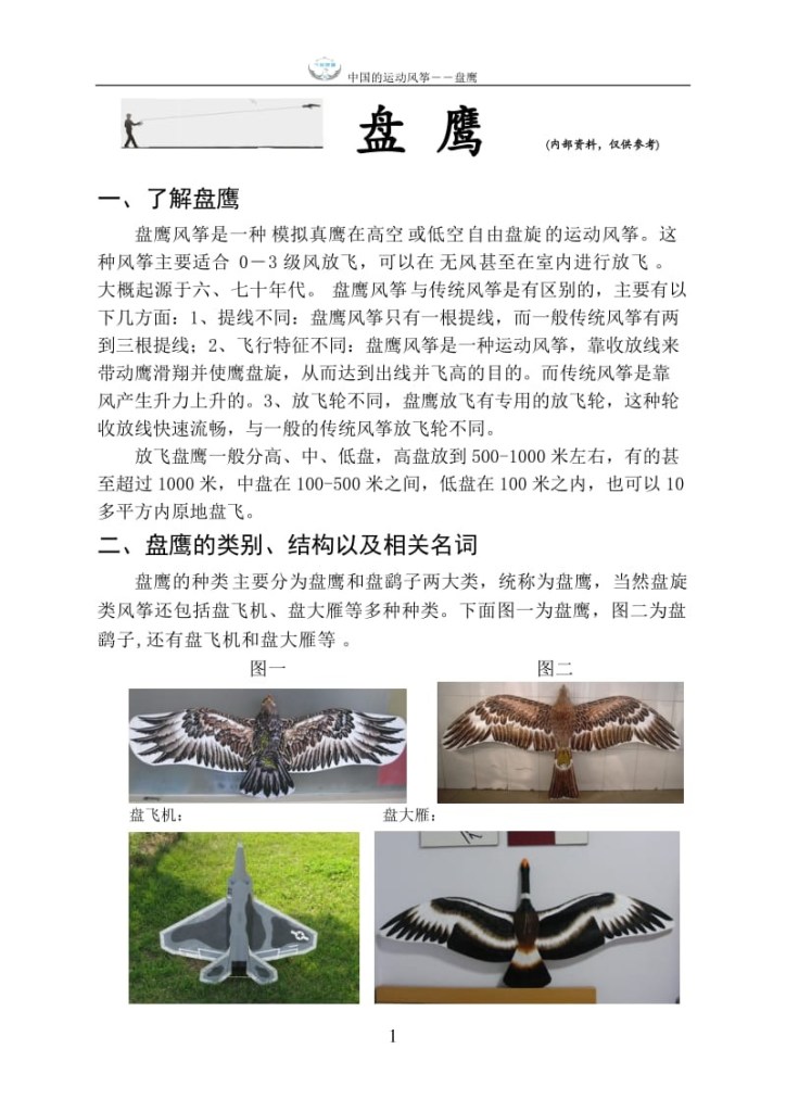 1、 中国的运动风筝盘鹰 盘 鹰 (内部资料,仅供参考)一、 了解盘鹰盘鹰风筝是一种模拟真鹰在高空或低空自由盘旋的运动风筝。这种风筝主要适合03级风放飞,可以在无风甚至在室内进行放飞。大概起源于六、七十年代。盘鹰风筝与传统风筝是有区别的,主要有以下几方面:1、提线不同:盘鹰风筝只有一根提线,而一般传统风筝有两到三根提线;2、飞行特征不同:盘鹰风筝是一种运动风筝,靠收放线来带动鹰滑翔并使鹰盘旋,从而达到出线并飞高的目的。而传统风筝是靠风产生升力上升的。3、放飞轮不同,盘鹰放飞有专用的放飞轮,这种轮收放线快速流畅,与一般的传统风筝放飞轮不同。放飞盘鹰一般分高、中、低盘,高盘放到500-1000米左右,