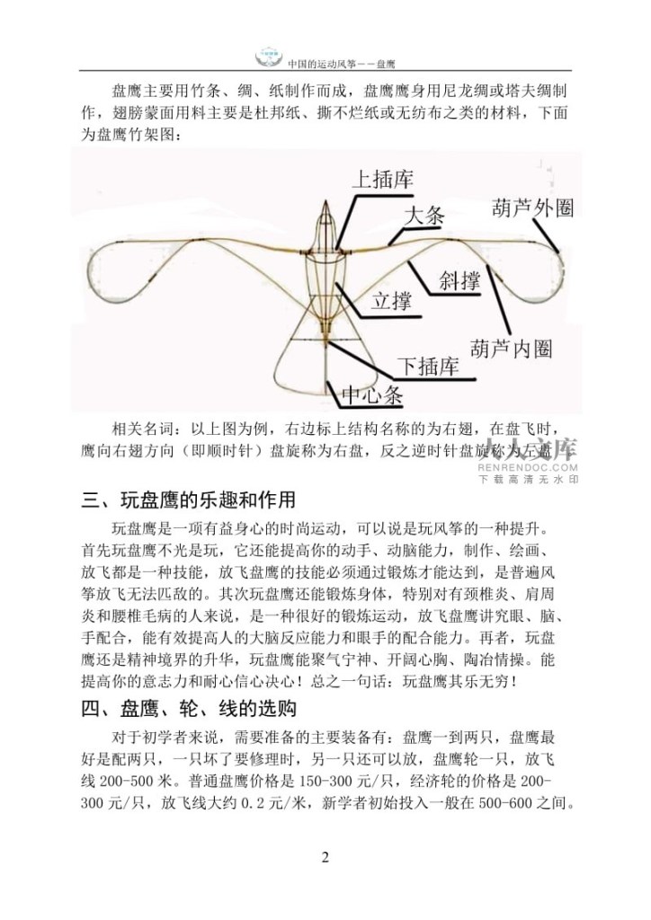 2、有的甚至超过1000米,中盘在100-500米之间,低盘在100米之内,也可以10多平方内原地盘飞。二、 盘鹰的类别、结构以及相关名词盘鹰的种类主要分为盘鹰和盘鹞子两大类,统称为盘鹰,当然盘旋类风筝还包括盘飞机、盘大雁等多种种类。下面图一为盘鹰,图二为盘鹞子,还有盘飞机和盘大雁等。图一图二盘飞机: 盘大雁:盘鹰主要用竹条、绸、纸制作而成,盘鹰鹰身用尼龙绸或塔夫绸制作,翅膀蒙面用料主要是杜邦纸、撕不烂纸或无纺布之类的材料,下面为盘鹰竹架图:相关名词:以上图为例,右边标上结构名称的为右翅,在盘飞时,鹰向右翅方向(即顺时针)盘旋称为右盘,反之逆时针盘旋称为左盘。三、 玩盘鹰的乐趣和作用玩盘鹰是一项有