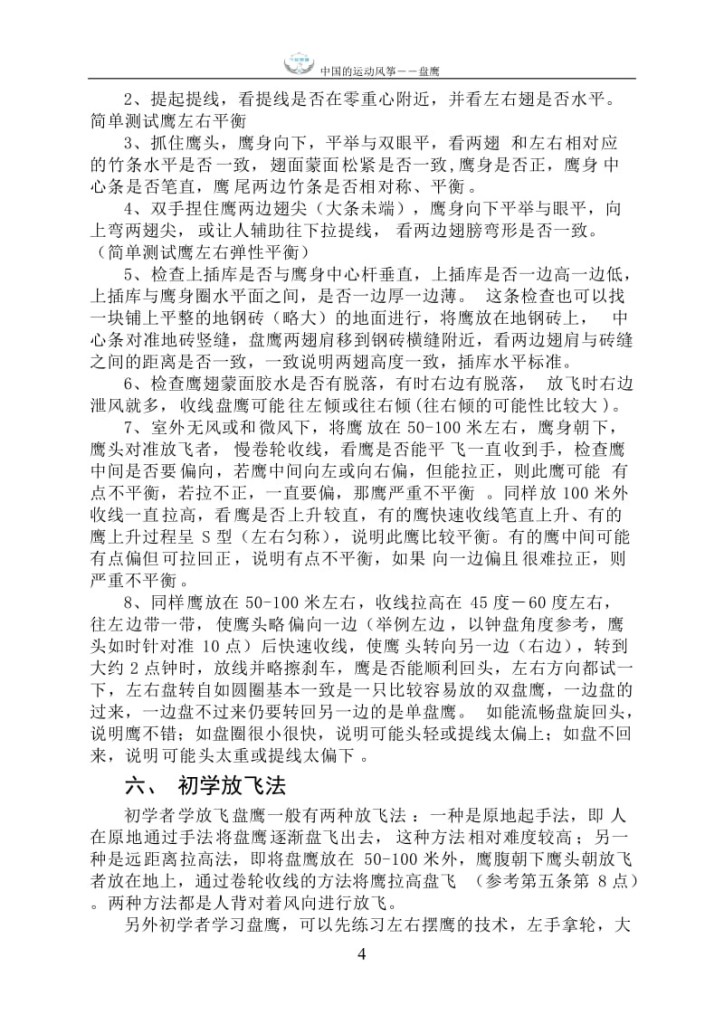 10、否能顺利回头,左右方向都试一下,左右盘转自如圆圈基本一致是一只比较容易放的双盘鹰,一边盘的过来,一边盘不过来仍要转回另一边的是单盘鹰。如能流畅盘旋回头,说明鹰不错;如盘圈很小很快,说明可能头轻或提线太偏上;如盘不回来,说明可能头太重或提线太偏下。六、 初学放飞法初学者学放飞盘鹰一般有两种放飞法:一种是原地起手法,即人在原地通过手法将盘鹰逐渐盘飞出去,这种方法相对难度较高;另一种是远距离拉高法,即将盘鹰放在50-100米外,鹰腹朝下鹰头朝放飞者放在地上,通过卷轮收线的方法将鹰拉高盘飞(参考第五条第8点)。两种方法都是人背对着风向进行放飞。另外初学者学习盘鹰,可以先练习左右摆鹰的技术,左手拿轮,大